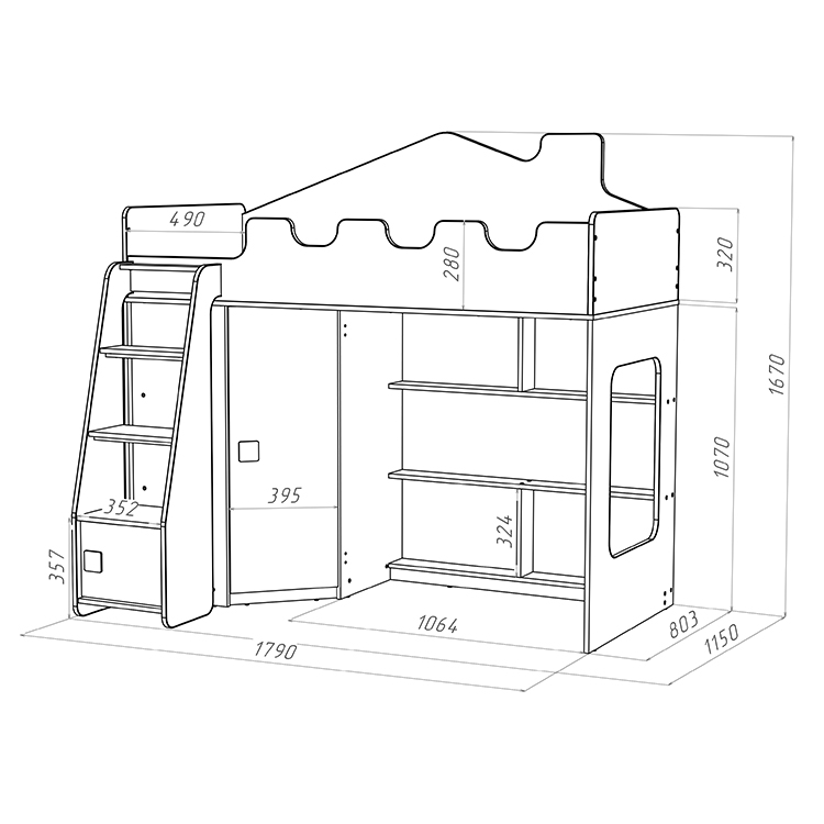 Отличительной особенностью данной модели является наличие прямой лестницы с дверкой, что добавляет элемент игры и позволяет ребенку легко и безопасно подниматься на свое спальное место. Угловой шкаф, расположенный на одном из фасадов кровати, предоставляет достаточно места для хранения одежды, игрушек и других предметов, которые должны быть под рукой.